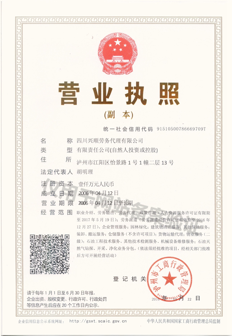 “四川興順勞務(wù)代理有限公司”由原“瀘州市興順勞務(wù)代理有限公司”更名而來(lái),公司始建于2006年初,是經(jīng)瀘州市勞動(dòng)和社會(huì)保障局瀘市勞就失(2006)12號(hào)文件批準(zhǔn)成立,四川省工商行政管理局核準(zhǔn)、瀘州市工商行政管理局登記注冊(cè)的其他有限責(zé)任公司,服務(wù)范圍有:勞務(wù)派遣、勞務(wù)代理、勞務(wù)輸出、職業(yè)介紹、建筑物清潔服務(wù)、其他保潔服務(wù)、技術(shù)服務(wù)、石油天然氣鉆探、開(kāi)采、凈化業(yè)務(wù)分包、企業(yè)管理服務(wù)、搬運(yùn)、裝卸服務(wù)、園林綠化、物業(yè)... 【查看詳情】